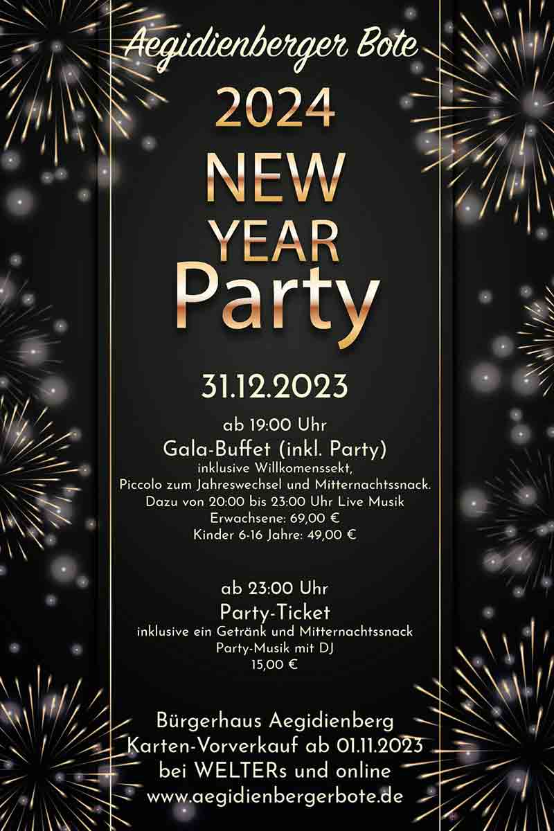 Aegidienberg. So, 31. Dez. Gala-Buffet mit Live Musik inkl. Willkommenssekt, Piccolo zum Jahreswechsel, Mitternachtssnack & Party im Bürgerhaus Aegidienberg. Kartenvorverkauf (Gala oder nur Party) bei WELTERs, Mark-Hövel-Str. 3 oder über aegidienbergerbote.de