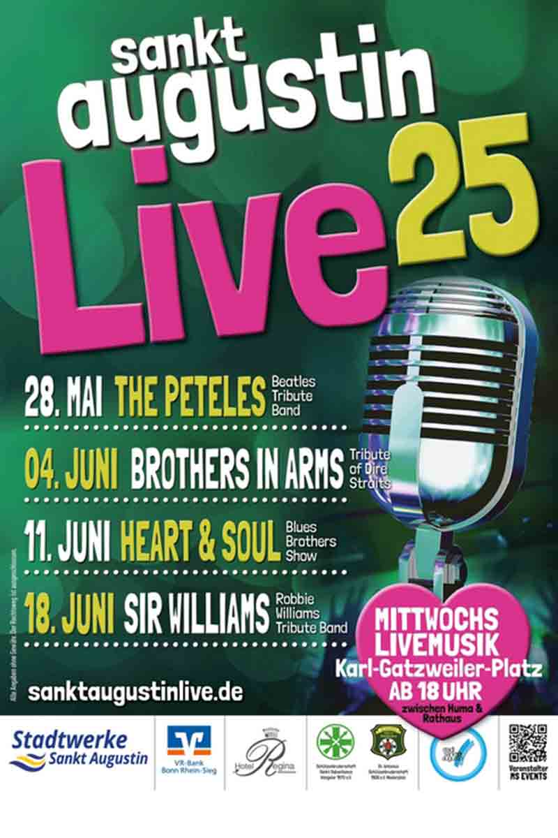Rhöndorf. Fr, 20. Juni. Anlass ist das Beatles-Jubiläum – 65 Jahre Beatles! Gefeiert wird mit den „Silver Beatles” – mehr als irgendeine Coverband. Sie sind eine Größe innerhalb der Welt der Tribute Shows. Der Abend ist ein Gemeinschaftsprojekt vom Bürger- und Ortsverein Rhöndorf und der KG Löstige Geselle. Ziepchensplatz