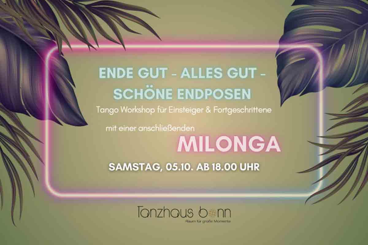 Bonn. Samstag, 05.10. 18:00 Uhr bis 19:00 Uhr: Workshop “Ende gut – Alles gut” Endposen für Fortgeschrittene. 19:00 Uhr bis 20:00 Uhr: Tango Argentino für Einsteier ohne Vorkenntnisse! Tanzhaus Bonn