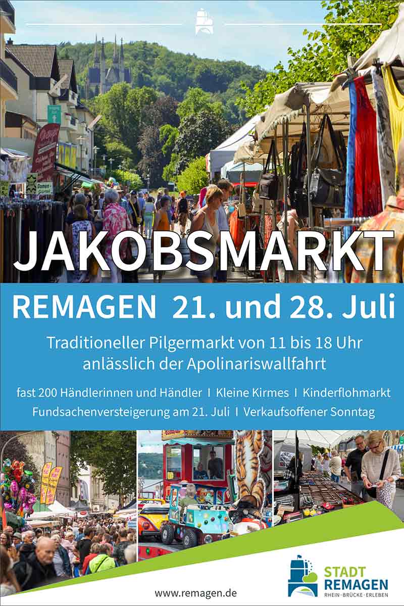 Remagen. So, 28. Juli. Fast 200 fliegende Händler werden erwartet. Im Angebot: Gemüsehobel, Messer, Scheren, Haushaltswaren, alles rund ums Bügeln, Putzen und Backen, Textilien für Jung und Alt, Blumen, Lederwaren, Accessoires bis hin zum Fliegengitter. Verkaufsoffenen Sonntag. Um 14:30 Uhr werden vor dem Rathaus Fundsachen (z.Bsp. eine Vielzahl von Kinder-, Damen- und Herrenfahrrädern) öffentlich versteigert. Kleiner „Rummelplatz“ für Kinder und Kinderflohmarkt in der Bachstraße. Vielfältige gastronomische Angebote.