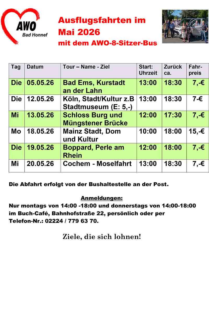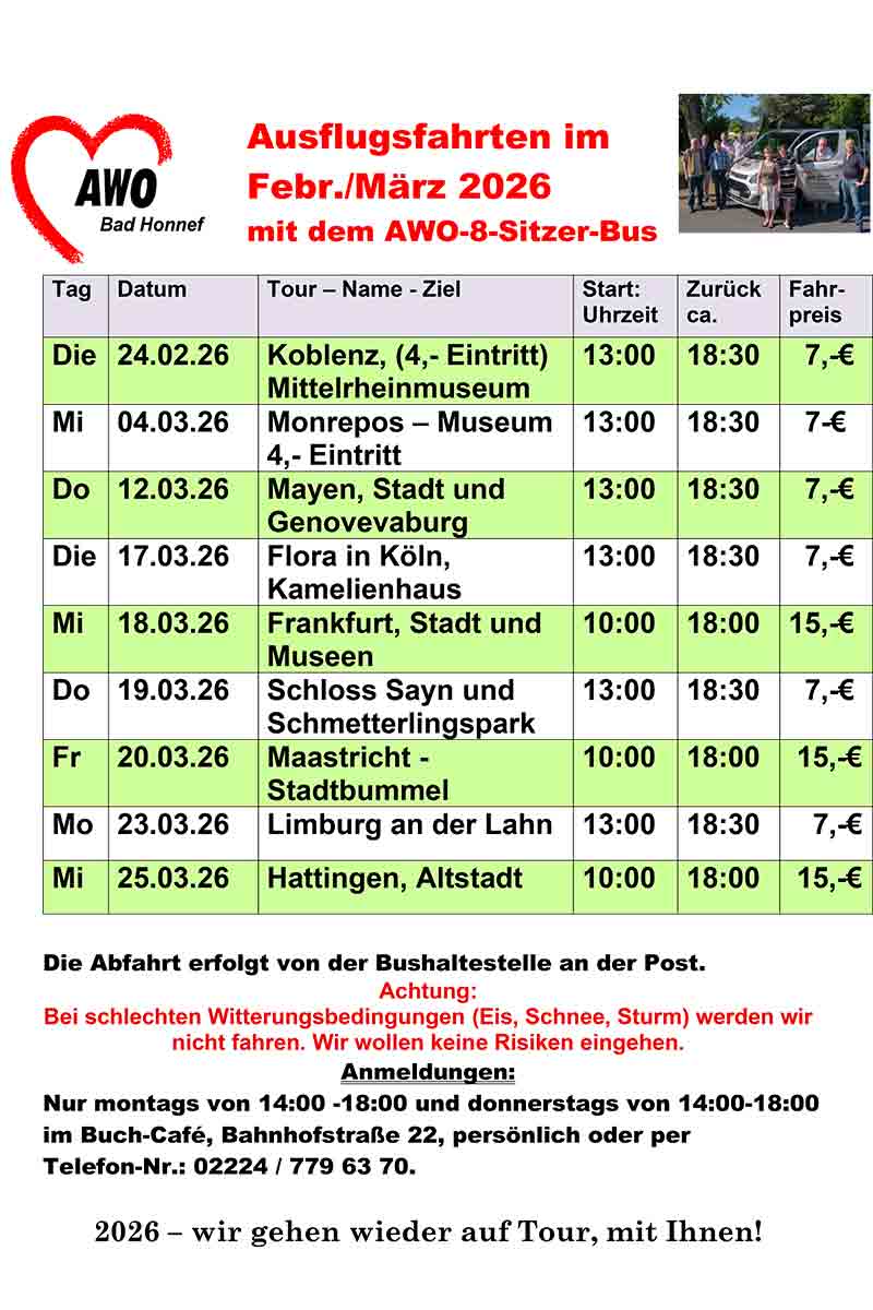 StartAllgemeinAWO-Ausflugsfahrten März 2026 AWO-Ausflugsfahrten März 2026 Vorheriger ArtikelSelbsthilfegruppe Sucht in KönigswinterNächster ArtikelGOP. Varieté-Theater