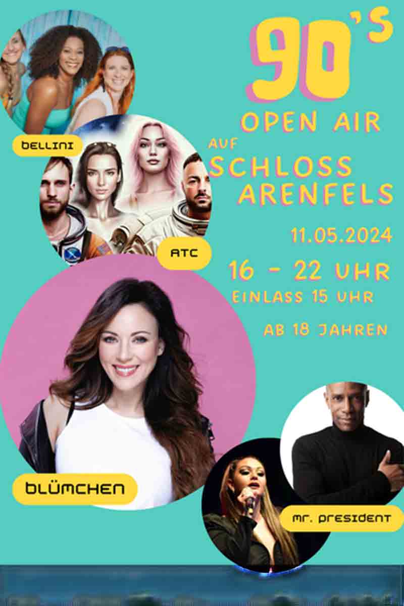 Am Samstag, den 11. Mai 2024 wird Schloss Arenfels zum Schauplatz einer Open Air Show, die 90er-Jahre Musikfans begeistern wird. Von 15 bis 22 Uhr kannst du beliebte Musikacts der 90er wie ATC, Bellini, Blümchen und Mr. President live erleben.