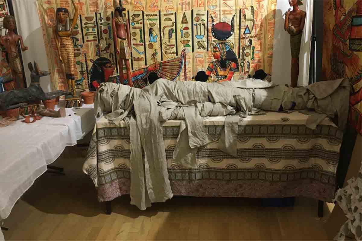 Basteln und gespielter Ausbau eines Grabes für eine Ägyptische Königin (Mumifizierung einer Schaufensterpuppe). Gerne geben wir auf Museumziehtum@web.de und HorstCreutz@gmx.de mehr Informationen