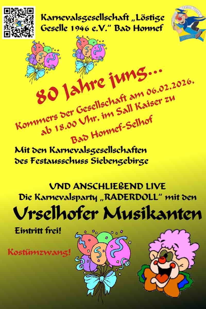 Unter dem Motto „Wir werden 80 Jahre jung…“ laden die „Löstige Geselle“ am Freitag, 6. Februar 2026, ab 18 Uhr zum großen Festkommers in den Saal Kaiser nach Bad Honnef-Selhof ein. Erwartet werden unter anderem zahlreiche Karnevalsgesellschaften aus dem Geschäftsbereich des Festausschusses Siebengebirge. Im Anschluss an den offiziellen Teil geht die Feier nahtlos über in die beliebte Veranstaltung „RADERDOLL“, musikalisch begleitet von den Urselhofer Musikanten.