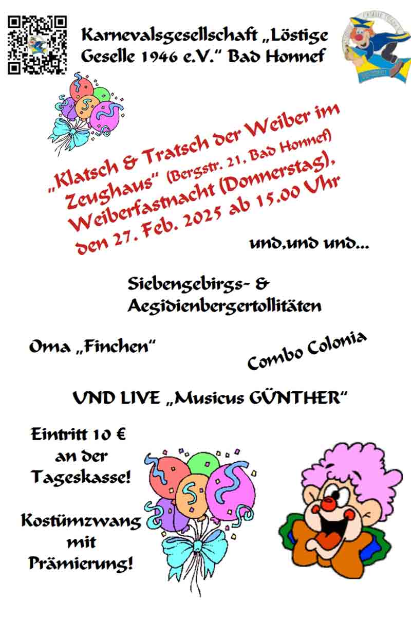 Das Damenkomitee der KG Löstige Geselle 1946 e.V. Bad Honnef lädt an Weiberfastnacht zu „Klatsch & Tratsch der Weiber“ im Zeughaus der KG Löstige Geselle, Bergstr. 21, Bad Honnef, ein. Erwartet werden neben befreundeten Tollitäten auch Oma Finchen, „Musicus GÜNTHER“ usw.