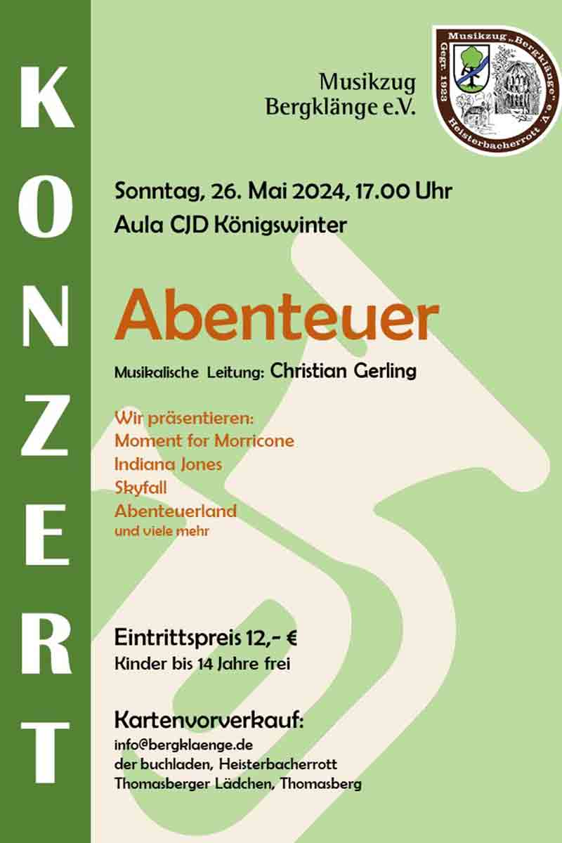 Der Musikzug Bergklänge unterhält u.a. mit Melodien aus „Fluch der Karibik“ oder dem James Bond Film „Skyfall“. Das Konzertmotto „Abenteuer“ verspricht gute Unterhaltung und spannende Klangerlebnisse. Der Eintritt für Kinder bis 14 Jahres ist frei, für Erwachsene 12 EUR. Also auf ins Abenteuer mit dem Orchester der Bergklänge.