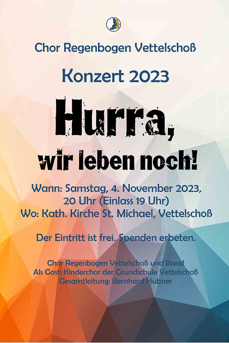 Nach der langen, viel zu langen Coronazeit genießen wir, der Chor Regenbogen Vettelschoss jede Probe und freuen uns darauf, endlich wieder ein Konzert singen zu dürfen. Am 4. November 2023 ist es dann soweit. Unter der Leitung von Bernhard Hubner laden wir Euch, liebes Publikum, in die kath. Kirche in Vettelschoss ein, um einen bunten musikalischen Strauß mit Musik von legendären Künstlern zu präsentieren. Viele bekannte Melodien laden dabei zum Mitsummen ein, einige Texte aber auch zum Nachdenken. Gute Laune ist auf jeden Fall garantiert. Also Kalender holen, Termin notieren und sich schon mal freuen.