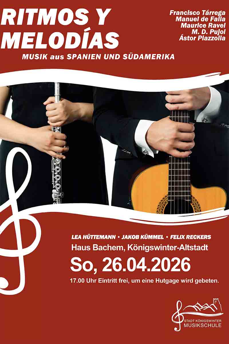 Am Sonntag, den 26. April 2026, wird im Haus Bachem in Königswinter ein außergewöhnliches Konzert zu erleben sein. Um 17 Uhr entführen die Musiker Jakob Kümmel (Gitarre), Felix Reckers (Gitarre) und Lea Hüttemann (Querflöte) ihr Publikum auf eine faszinierende musikalische Reise durch die traditionsreiche und leidenschaftliche Musik Spaniens und Südamerikas.