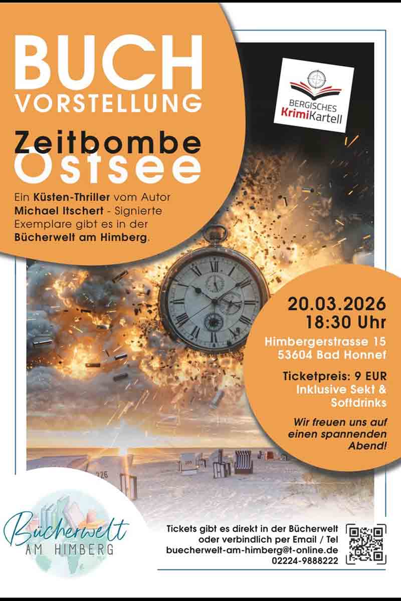Autor Michael Itschert liest aus seinem Küsten Thriller „Zeitbombe Ostsee“. Freuen Sie sich auf einen literarischen Abend mit dem gebürtigen Bad Honnefer.