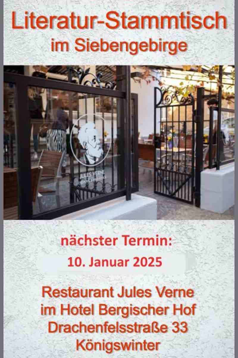Das ersten Treffen unseres neugegründeten Literatur-Stammtisches waren ein voller Erfolg. Engagierte Bücherfreundinnen und -freunde trafen sich im Restaurant Jules Verne in Königswinter und stellten ihre aktuellen Leseempfehlungen vor. Wir sprachen über kommende Veranstaltungen in der Region und wie man am einfachsten davon erfährt (z. B. durch den LiS-Newsletter).