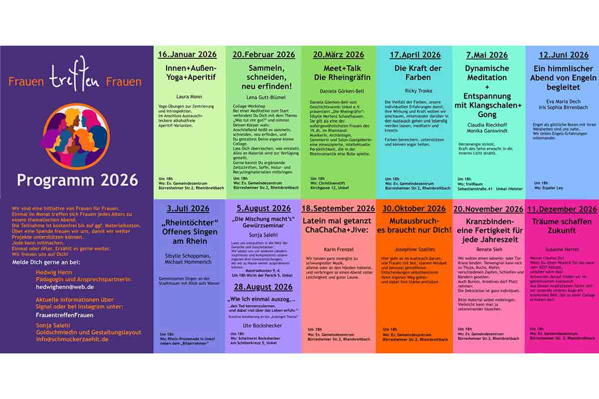 „Frauen treffen Frauen“: Wir sind eine Initiative von Frauen für Frauen aus Unkel und Rheinbreitbach. Einmal im Monat treffen sich Frauen jedes Alters zu einem thematischen Abend. Die Teilnahme ist kostenfrei bis auf ggf. Materialkosten. Über eine Spende freuen wir uns, damit wir weiter Projekte unterstützen können.