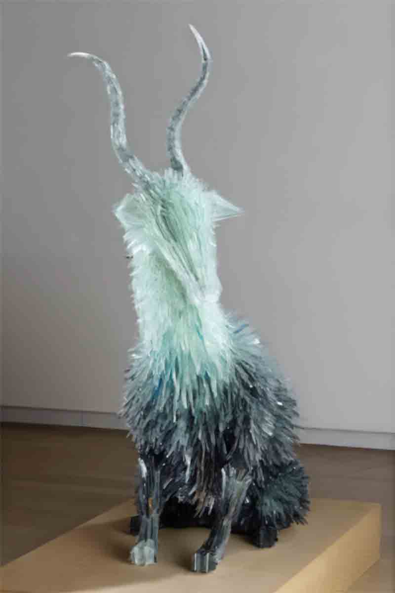 Marta Klonowska, Glasobjekt und Gemäldereproduktion Ziege aus dem Gemälde „Landschaft mit Apollo und der Cumäischen Sybille“, Düsseldorf, Deutschland, 2008, Metallgerüst; Flachglasscherben, Silikon; Reproduktion auf Papier eines Gemäldes, (H x B x T): 126 × 80 × 48 cm, Ankauf, Foto: Kunstpalast, Düsseldorf