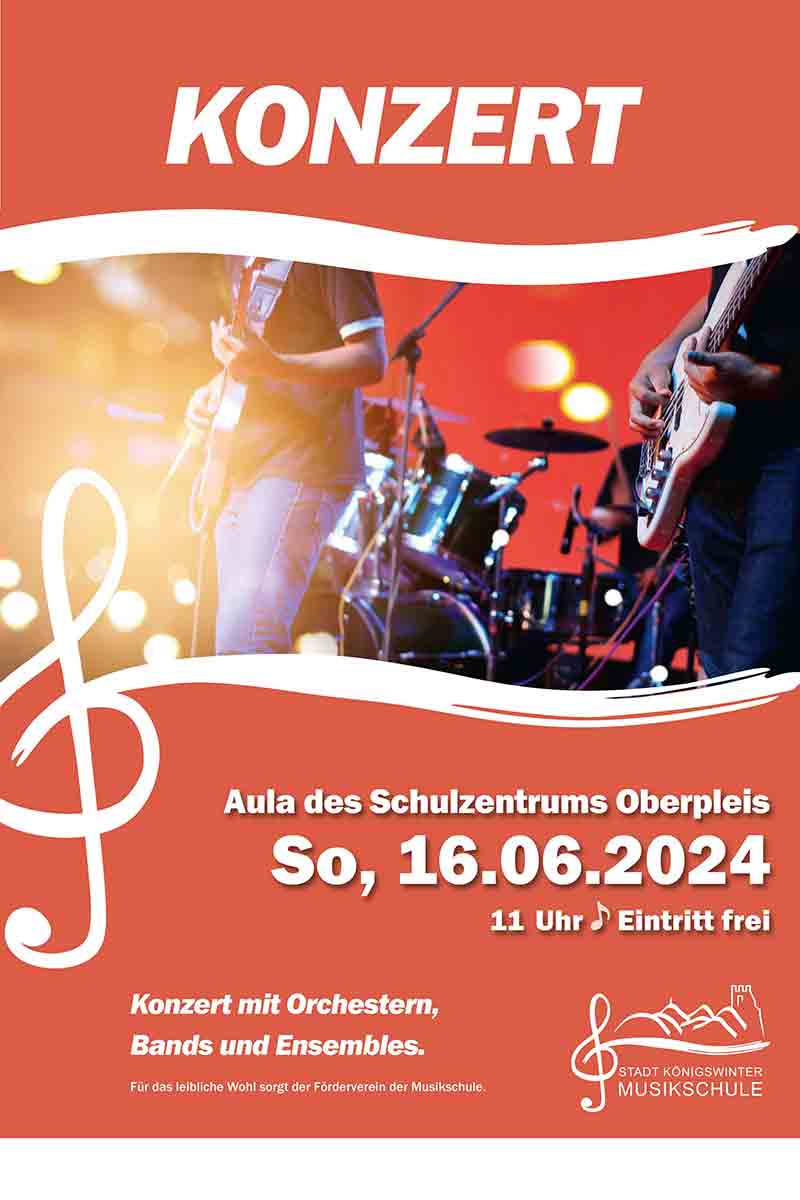 Am Sonntag, den 16. Juni um 11 Uhr lädt die Musikschule der Stadt Königswinter zu einem Konzert in die Aula des Schulzentrums Oberpleis ein, das ganz im Zeichen des gemeinsames Musizierens steht. Es präsentieren sich die unterschiedlichen Bands, Orchester und Ensembles der Musikschule: Von den Rock- und Pop-Bands, über ein Klavierduo und Bläserensembles bis hin zu den JeKits-Orchestern sind viele verschiedene Formationen im Einsatz und zeigen die ganze Vielfalt des gemeinsamen Musizierens in der Musikschule.
