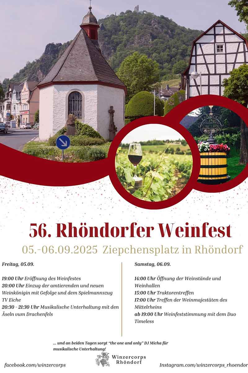 Zum 56. Mal findet das Weinfest auf dem Ziepchensplatz in Rhöndorf statt. Das Winzercorps mit der Weinkönigin Maike I. freuen sich auf zahlreiche Besucherinnen und Besucher.