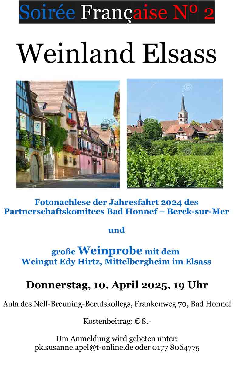 Fotonachlese der Jahresfahrt 2024 des Partnerschaftskomitees Bad Honnef-Berck-sur-Mer und große Weinprobe mit dem Weingut Edy Hirtz, Mittelbergheim, Elsass