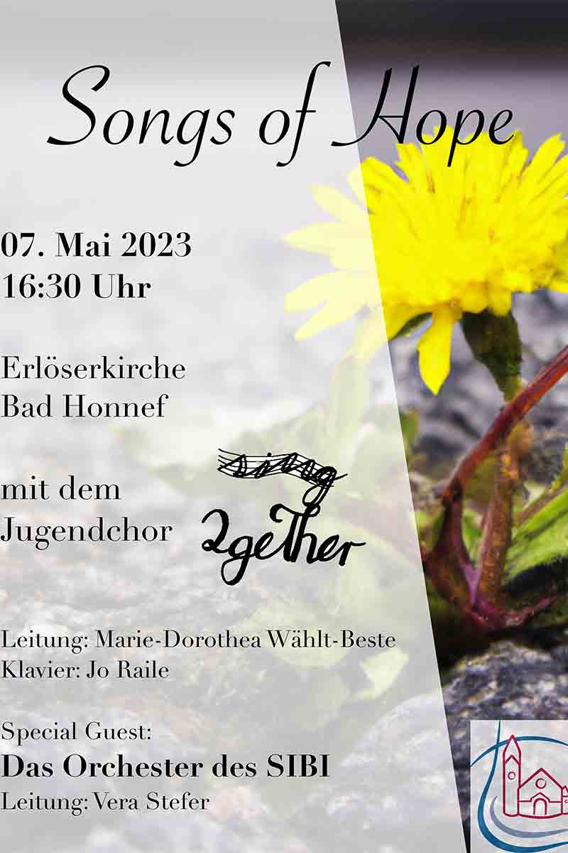 Der Jugendchor „Sing2gether“ der Evangelischen Kirchengemeinde Bad Honnef (Leitung: D. Wählt-Beste, Klavier: J. Raile) lädt zum Konzert am Sonntag, 7. Mai 2023 um 16.30 Uhr in die Erlöserkirche zu einem Konzert mit Liedern und Songs rund um das Thema Hoffnung ein.