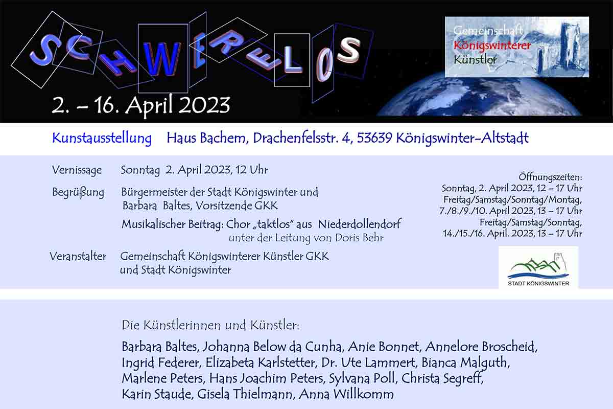 Kunstausstellung der Gemeinschaft Königswinterer Künstler*innen (GKK) im Haus Bachem, Königswinter. Das Thema lautet „Schwerelos“. Zu sehen sind Werke von 15 Künstlerinnen und Künstlern, in Form von Malerei und Objekten.
