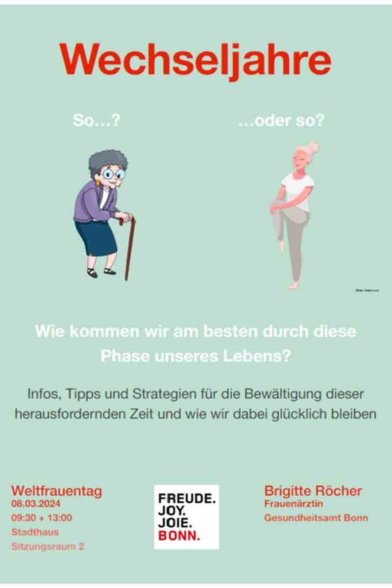 Brigitte Röcher, Frauenärztin vom Gesundheitsamt Bonn, nennt Strategien und gibt Infos und Tipps zur Bewältigung dieser herausfordernden Zeit. Der Vortrag wird von der Stabsstelle Gesundheit der Stadt Bonn in Kooperation mit der Gleichstellungsstelle anlässlich des Internationalen Frauentages 2024 angeboten.