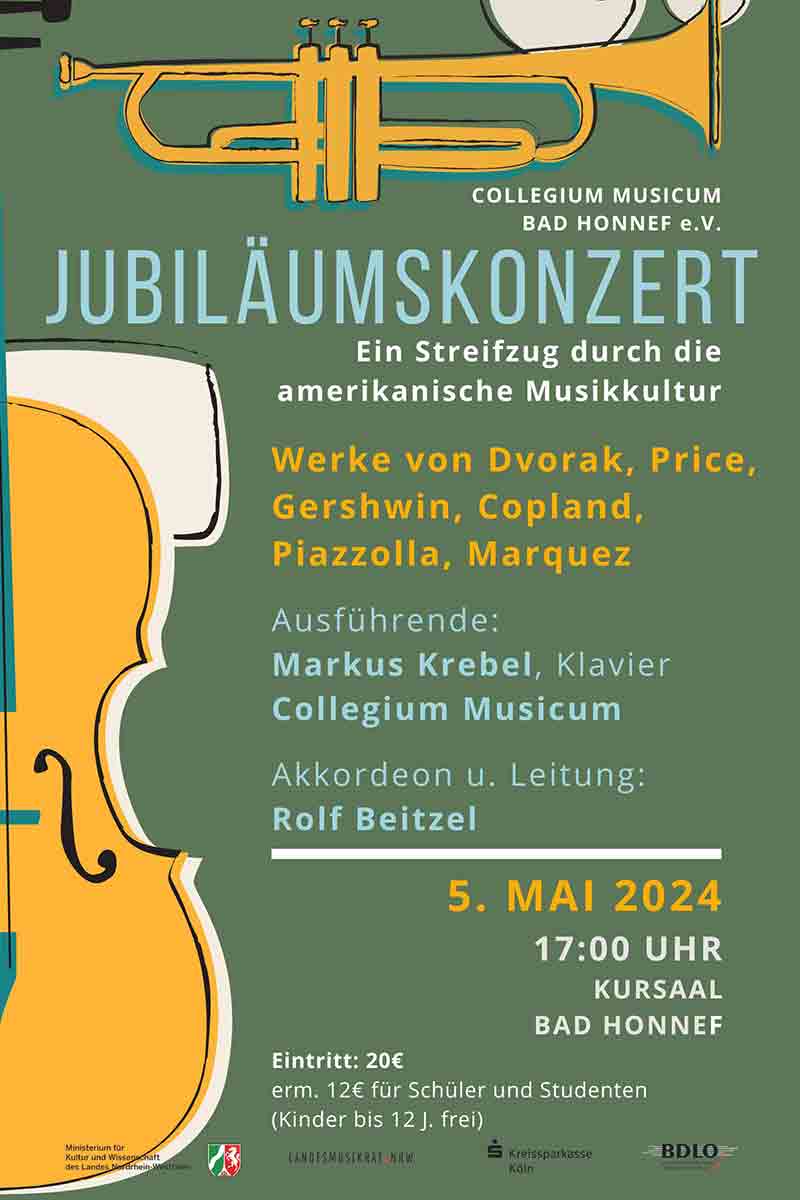 Bad Honnef. So, 5. Mai. Das Collegium Musicum Bad Honnef feiert in diesem Jahr sein 75-jähriges Bestehen. Aus diesem Anlass findet im Kursaal Bad Honnef ein Jubiläumdkonzert mit Weken von Copland, Dvorak, Gershwin, Price, Piazzolla und Marquez statt. Eintritt: 20 EUR / erm. 12 EUR für Schüler:innen und Studierende (Kinder bis 12 J. frei)