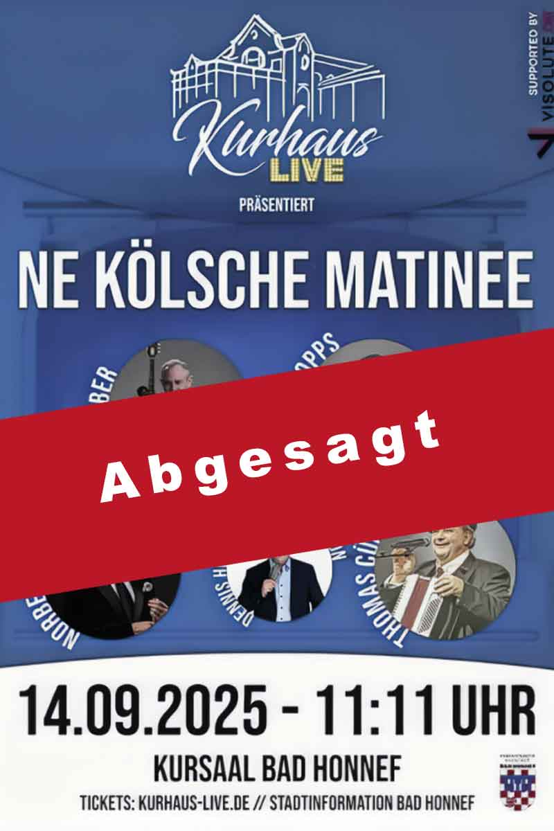 Bad Honnef. So, 14. Sept. „Alaaf – Mer dun et för et Kurhaus un för Bad Honnef“: Kölsche Matinee mit Norbert Conrads, Thomas Cüpper („Et Klimmpermännche“), Martin Schopps und J.P. Weber – Musik, Büttenreden und kölsche Tradition auf höchstem Niveau. Moderation: Dennis Heinemann. Ticketverkauf in der Stadtinfo und: www.kurhaus-live.de |
