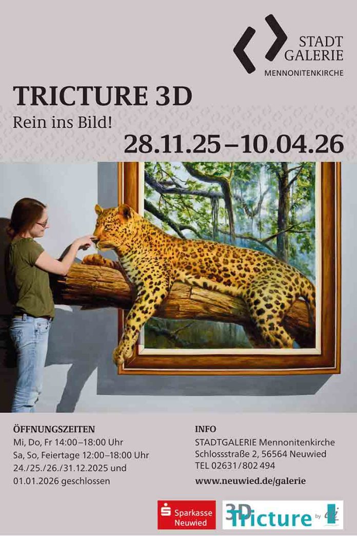 Die Stadtgalerie Mennonitenkirche in Neuwied lädt Sie ein, selbst zum Teil der Kunst zu werden! In der Ausstellung „Tricture 3D – Rein ins Bild!“ tauchen Sie in eine Welt aus faszinierenden 3D-Gemälden ein und können Ihrer Fantasie freien Lauf lassen. Sie möchten einen Leoparden streicheln, mit einem Piraten anstoßen oder einen Fisch vor dem hungrigen Bären retten? In dieser Ausstellung ist das möglich und lässt sich zudem in unvergesslichen Erinnerungsfotos festhalten …